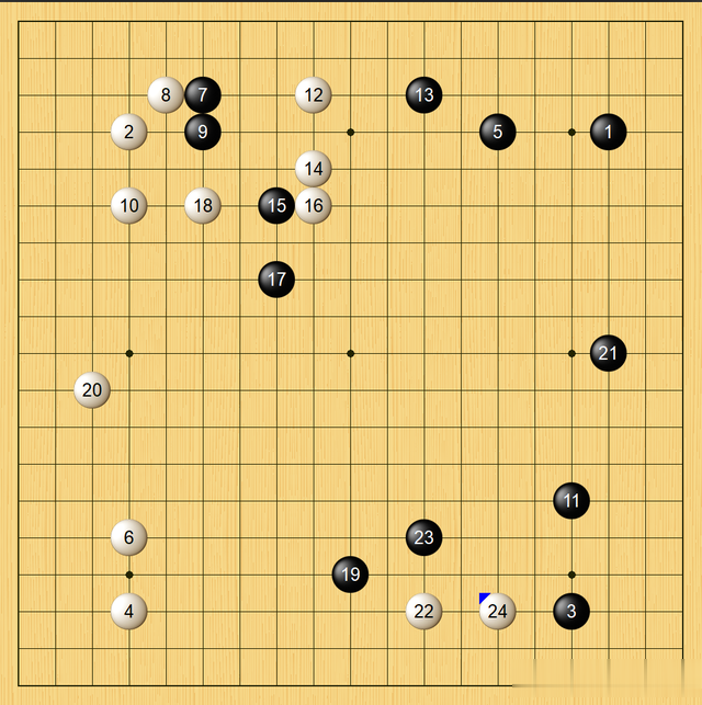 此战,王星昊执黑1、3手以错小目开局,申真谞2、4应以星小目(平行),王星昊执黑第5手只有两种下法,一种是实战在右上角缔大跳角,另一种是缔无忧角。实战第6手职业棋手主流下法是在右下角低挂,次则高挂,但申真谞选择较冷门的左下缔单关角,显然也是有针对性。布局阶段王星昊并没有明显失误,但如图到24手比对手多花10分钟。