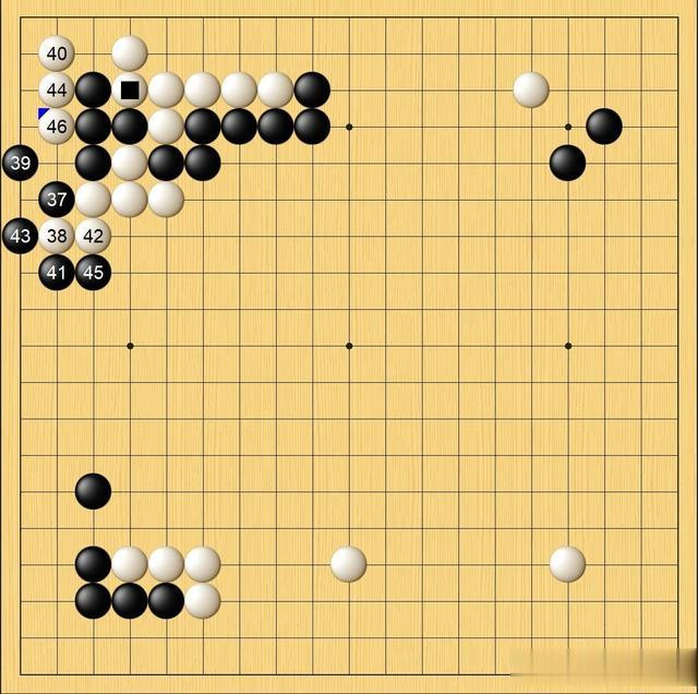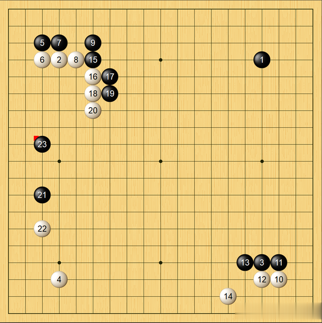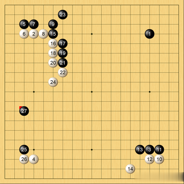 本局前7手是对角开局的流行下法之一,到第18手双方都是按AI前三选“摆棋”。20250111围甲总决赛李轩豪执黑以此布局战胜金禹丞,当时第9手是一间低夹白8。